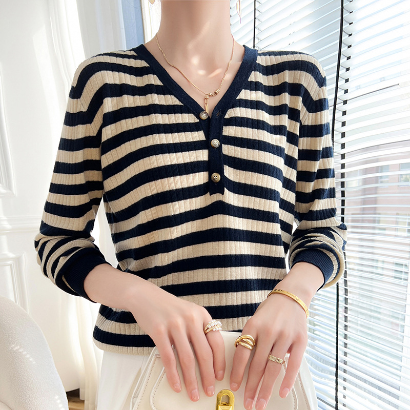 2024春の新型韓国版vネックボタンのファッション的なストライプのセーターの女性のゆったりとした底の長袖のウールのニット