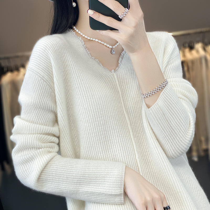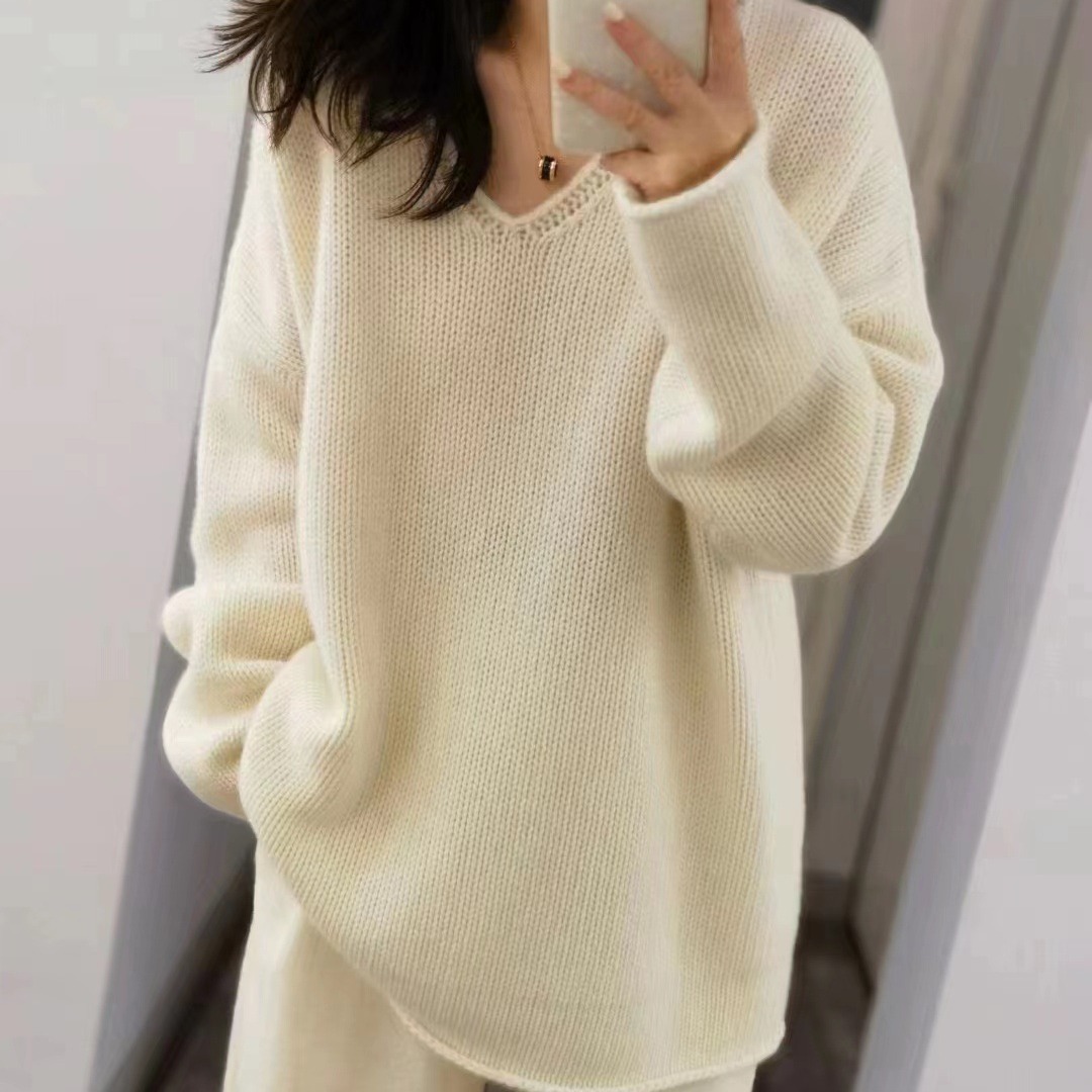 韓国版セーター女性2023秋冬ゆるい怠惰な風の新しい純色vネックセーター