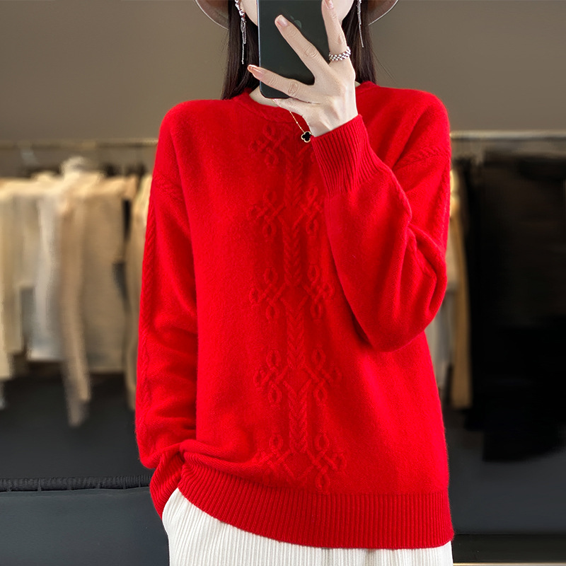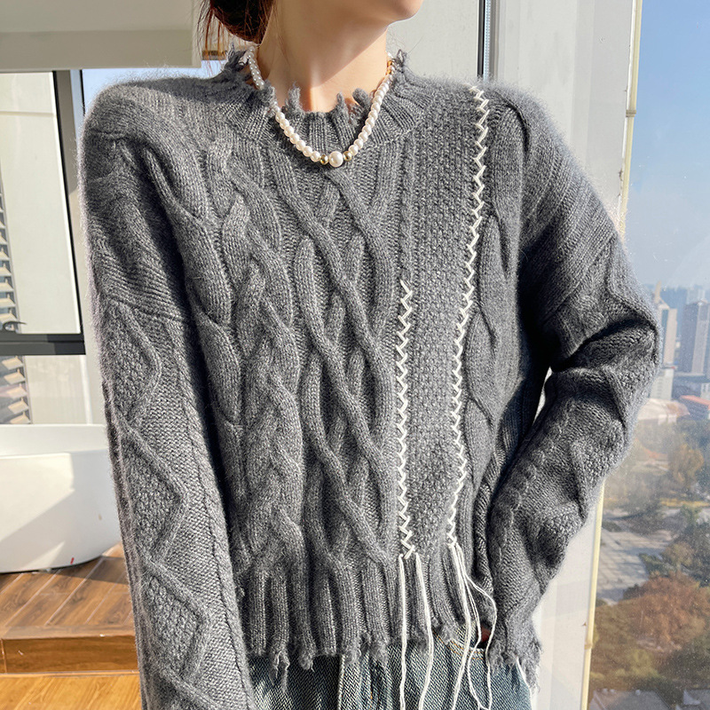 ゆったりとした怠惰な風の丸首2023ウールのセーターの女性のフリンジの花の長袖のセーターの厚い色合わせのウールの上着