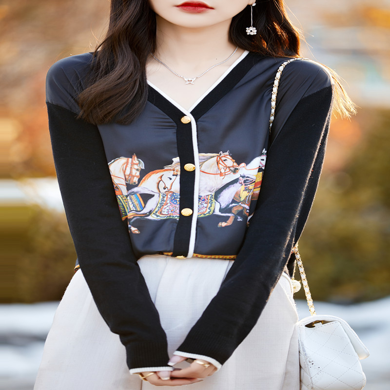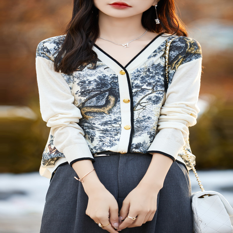 24春と秋の新しいコートの上着の女性の長袖の広いvネックのプリントはニットの百合の薄いウールのカーディガンをつなぎます。