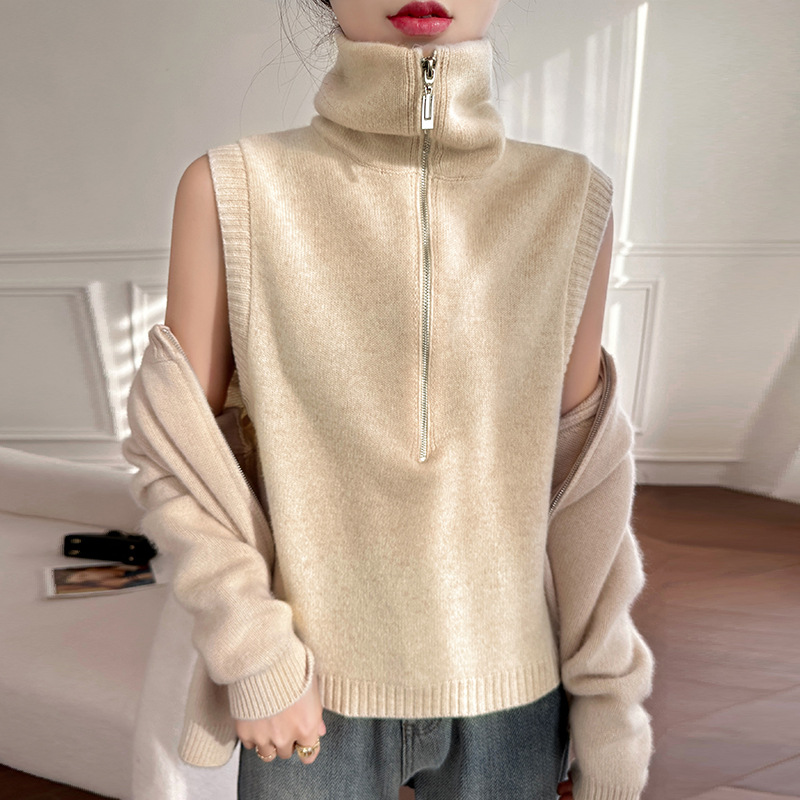 半ファスナー二重襟純色ウールベストレディース春新作ウール折り襟ノースリーブニットショルダー