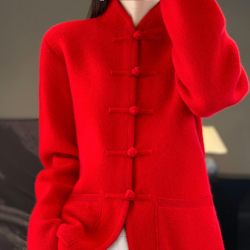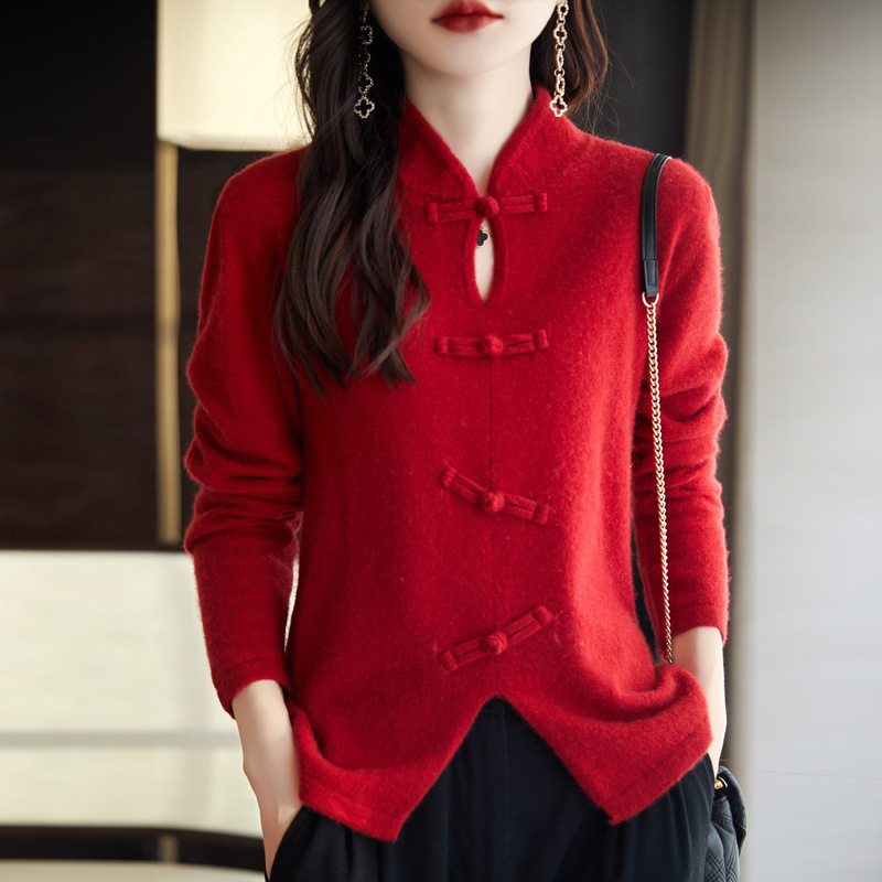 国風立襟新年赤いセーター女性新中国式不規則純色盤ボタンウール秋冬ニットシャツ