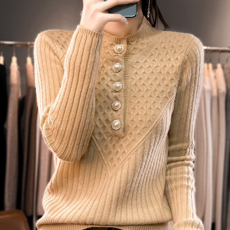 半開きの高襟の真珠のボタンの気質のファッションはやせているセーターの秋冬の韓国版の厚いウールのプルオーバーのニットの底のシャツを現します。