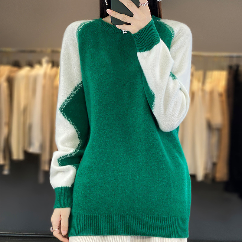色合わせの中の長いセーター2023秋冬の新型女性丸首の底のシャツの優しい風の長袖はゆったりしていて痩せています。