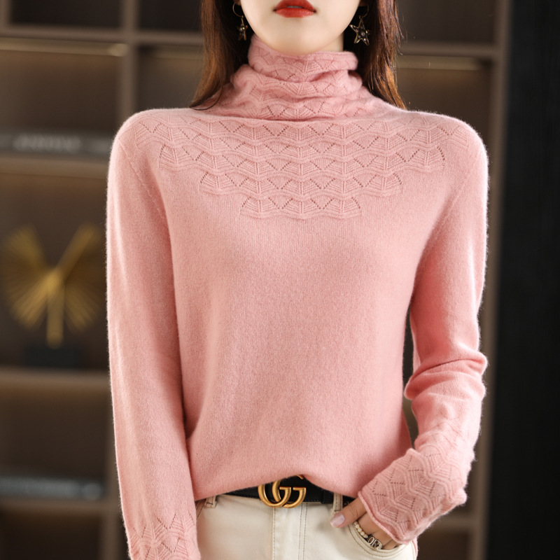 2023秋冬のウールのセーターの女性の短いタイプの山の高い襟の中に透かし彫りの頭の大きいサイズの底のシャツのニットのセーターを掛けます。