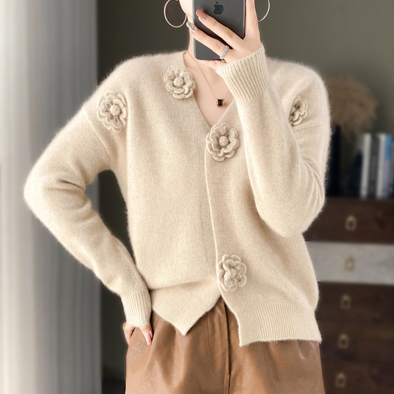 韓国のvネックの手編みの花のシンプルな純色の気質のカーディガンはゆったりとしていて痩せています。