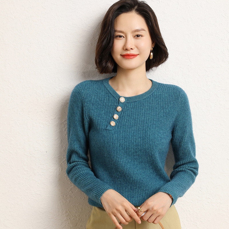 2023秋冬の新型女性の中に丸首の斜めボタンを掛けて長袖の頭を引っ張ります。