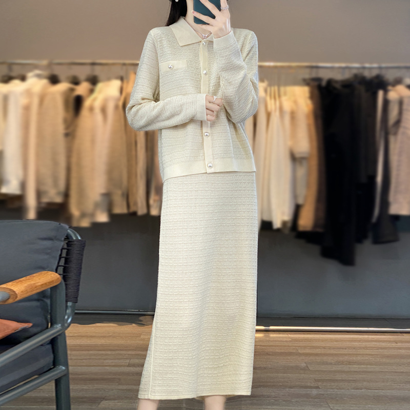 ウールのスーツの女性の襟をめくってカーディガンの半身のスカートの女性の秋冬のウールの2つのセットの女性