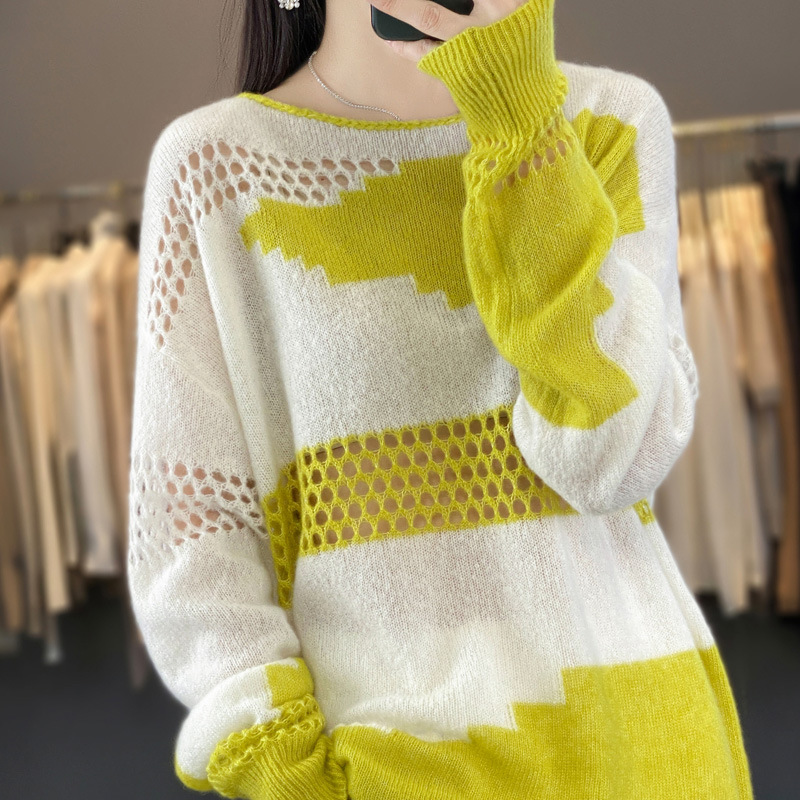 秋冬の新型ウールのセーターの女性の色合わせの丸首のプルオーバーのセーターの透かし彫りのニットのゆったりした長袖の底のシャツの上着