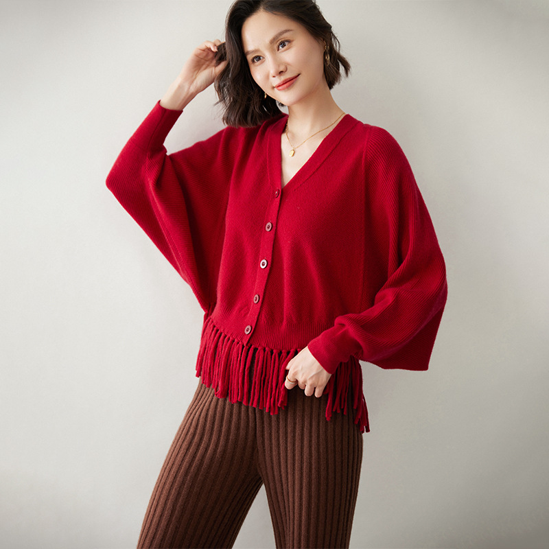 2023秋冬新作カシミヤニットカーディガン女性コートファッション百合vネックフリンジセーターゆったり大きいサイズ