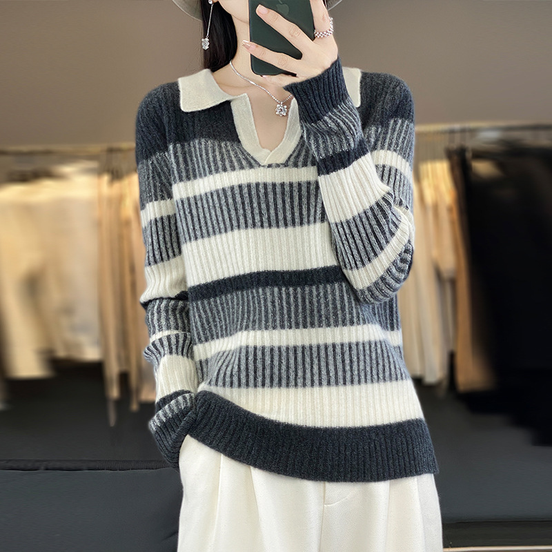 色合わせpolo襟のセーターの女性vネックの色合わせのニットの長袖のセーターはゆったりとしています。