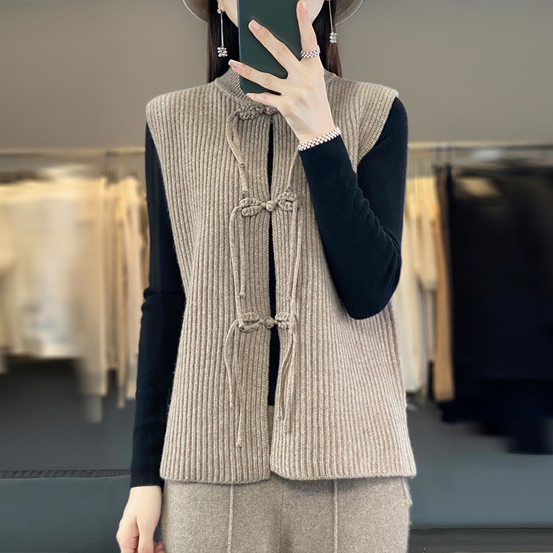 ウールベストのカーディガン女性の丸首のレトロな中国風のバックルのセーターのゆったりしたウールのニットのベストの肩