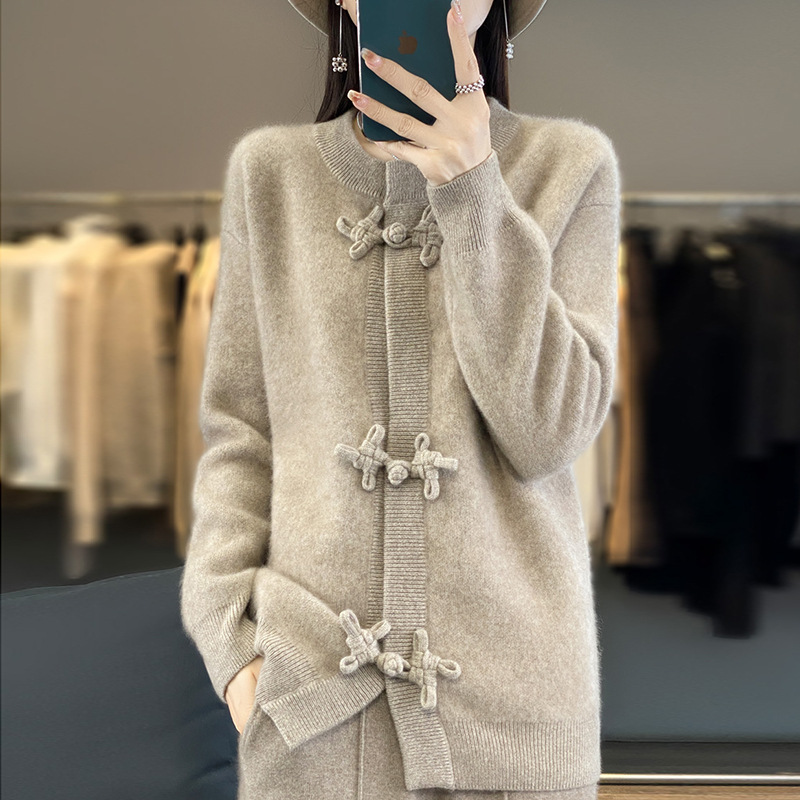 2023年秋冬新作丸首ウールカーディガン女性保温ファッション中国結び四平ウールカーディガン