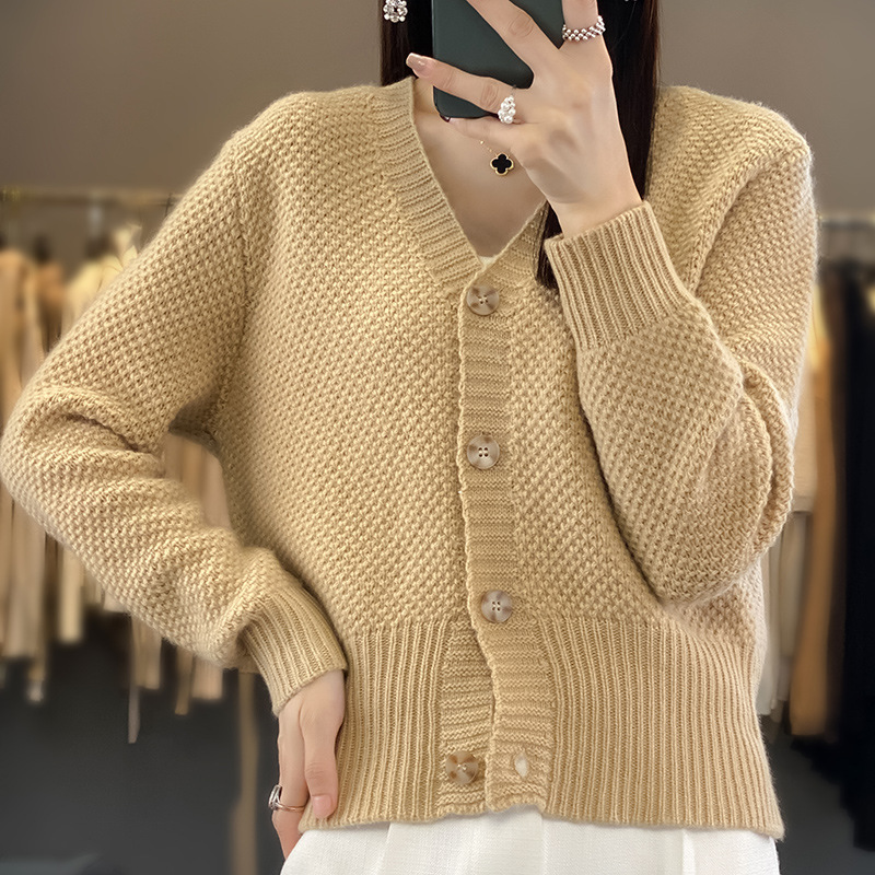 2023新型早秋vネックの短いニットカーディガンの女性春と秋の外に春の長袖の羊がセーターのコートを似せています。