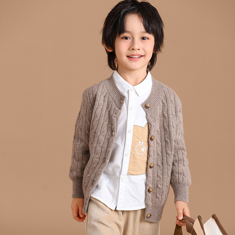 男女の子供の純色のウールのかわいいレトロな麻の花のニットのカーディガンは丸首の純色の洋風のセーターの潮を厚くします。