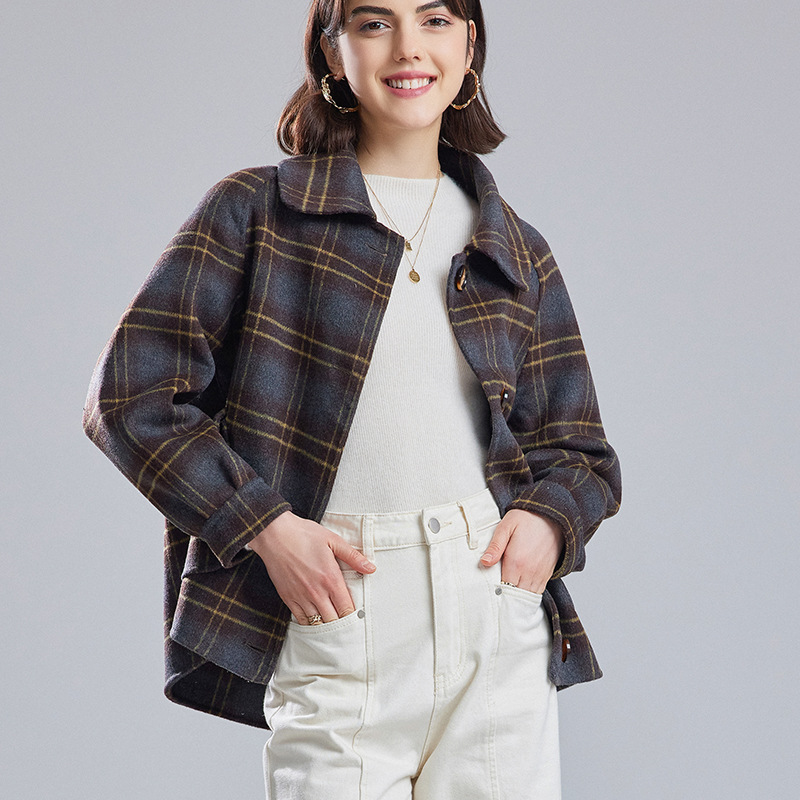両面はウールコートの女性の短い2023秋の新しい格子の小さい子羊の毛のコートのコートです。