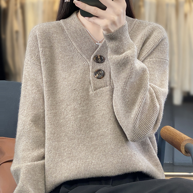 Vネックの厚い元宝の針のウールのセーターの女性のウールの怠惰な風の頭のファッションのデザイン感のニットのセーターの2023