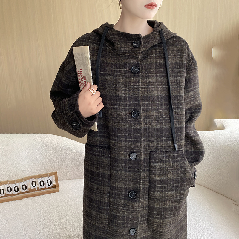 2023秋冬新作韓国版帽子付きのゆったりした格子とロングタイプの両面はウールコートの女性コートです。