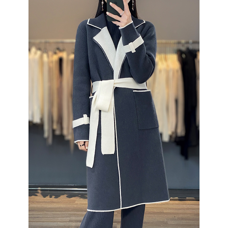 2023新型両面ウールカーディガンの中長コート秋冬気質襟ベルトニットコートの女性