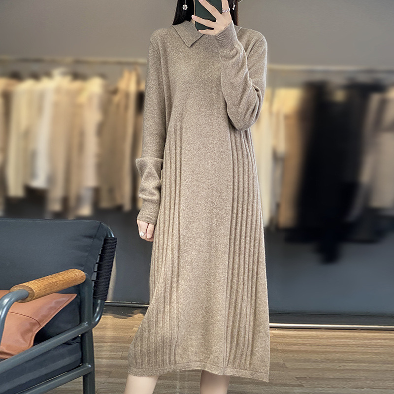 2023秋の新型ウールニットワンピース女性のロングタイプpolo襟のセーターのスカートがゆったりしていて、着痩せしています。