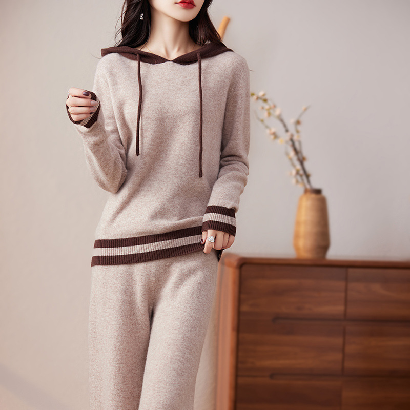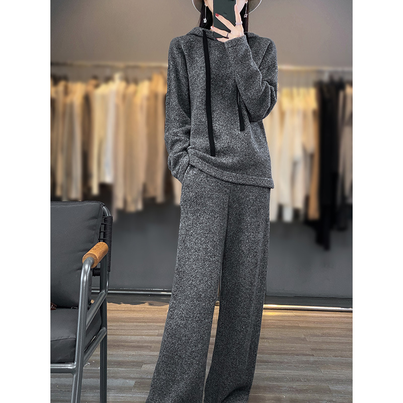 秋冬2023新作韓国版カジュアルニットウールスーツ女装ゆるいフード付きワイドパンツ2点セット