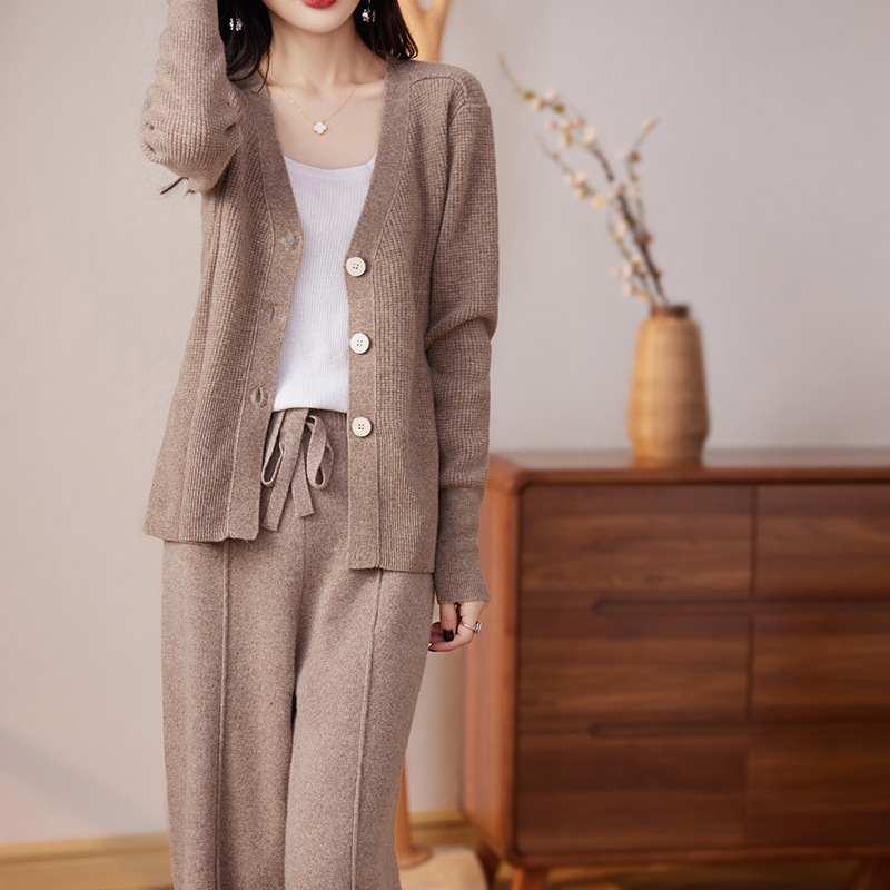 2023秋の新型純色ウールニットセット女性vネック純色カーディガン韓国版ワイドパンツ2点セット