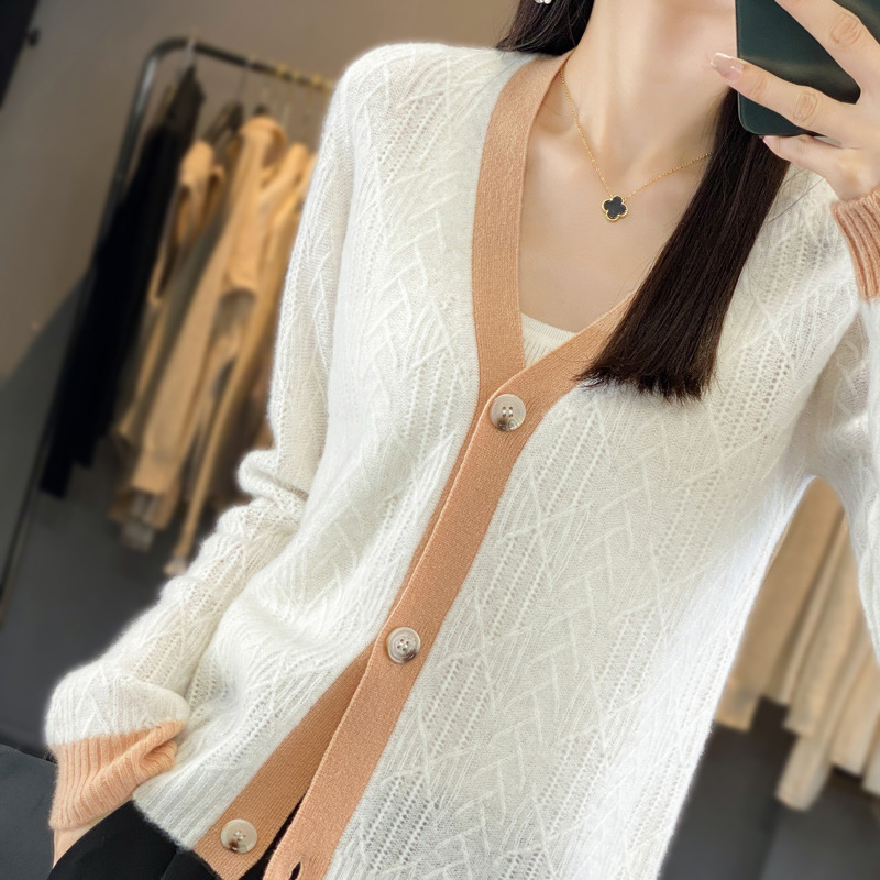 新商品2023秋冬ウールカーディガンゆったりコート女性襟セーター色合わせ上着ボトムニット
