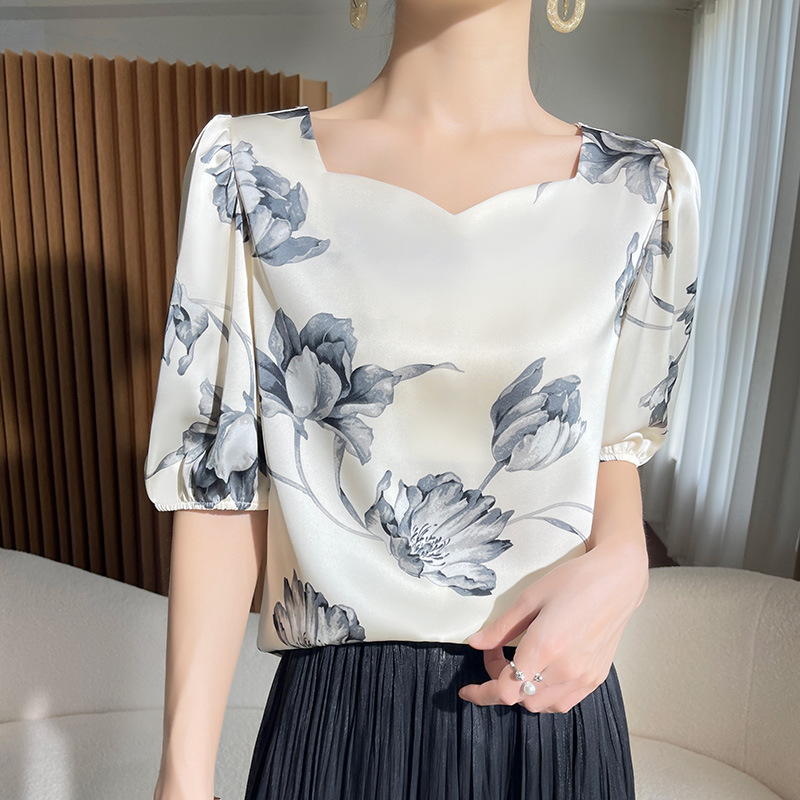 メーカー卸売り2023新型酢酸サテン襟元しわ夏女性tシャツファッション痩せブラウス