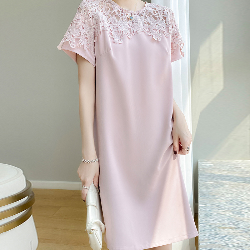 甘くて優雅な小香風のワンピースの女性の新型の透かし彫りのレースの半袖の薄いタイプは肉を遮ってやせている中で長いスカートを現します。
