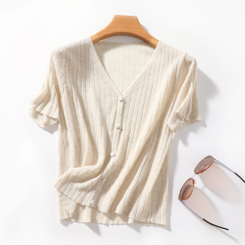 2025 夏の新ラミーニット Tシャツ半袖女性のルーズ V ネックプルオーバーショートコート薄いカーディガントップ