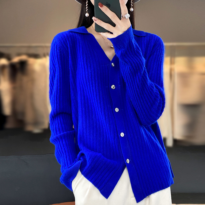 早春polo襟付きウールシャツの女性は痩せて見えるニットシャツのセーターのカーディガンの短い長袖の上着を着ています。
