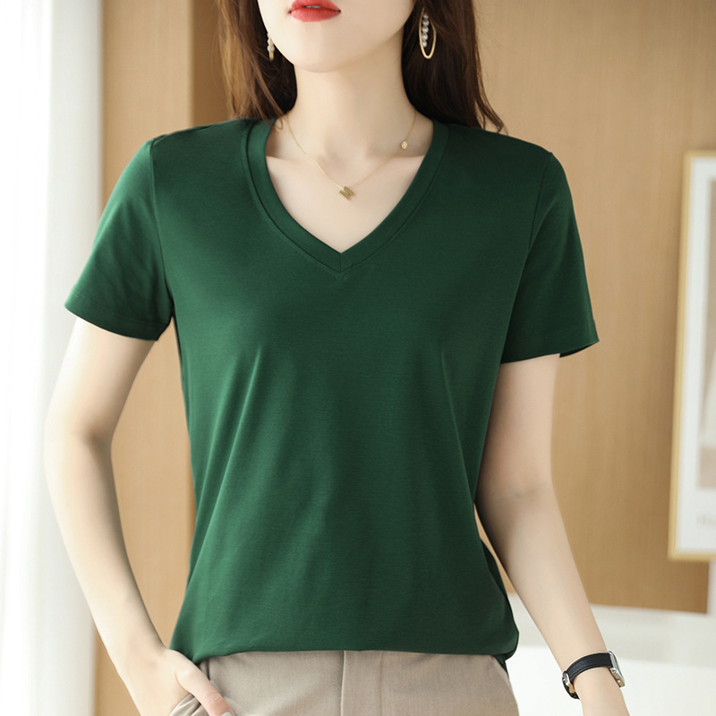 ヨーロッパ駅2023夏の新型シルク綿vネック半袖tシャツ女性内装ゆるい韓国版ファッション純色上着