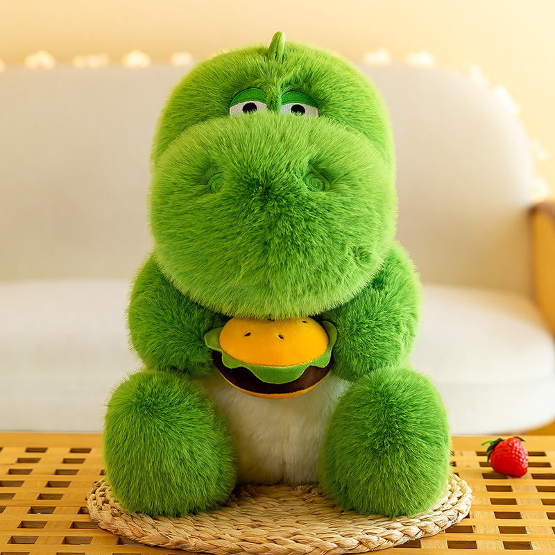 ぼんやりと萌えている恐竜の子供の男の子のぬいぐるみのベッドの上で枕を抱いて寝ている赤ちゃんのぬいぐるみの女性をなだめます。