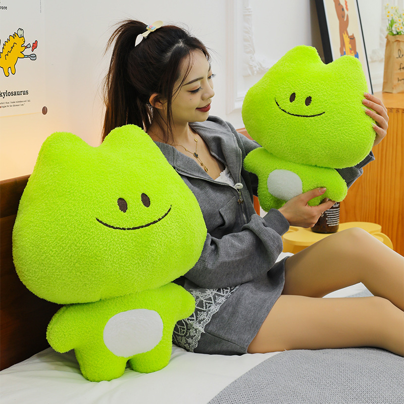 漫画の大きな目のカエルのぬいぐるみのぬいぐるみは枕を抱いて子供の人形の結婚祝いにプレゼントを投げます。