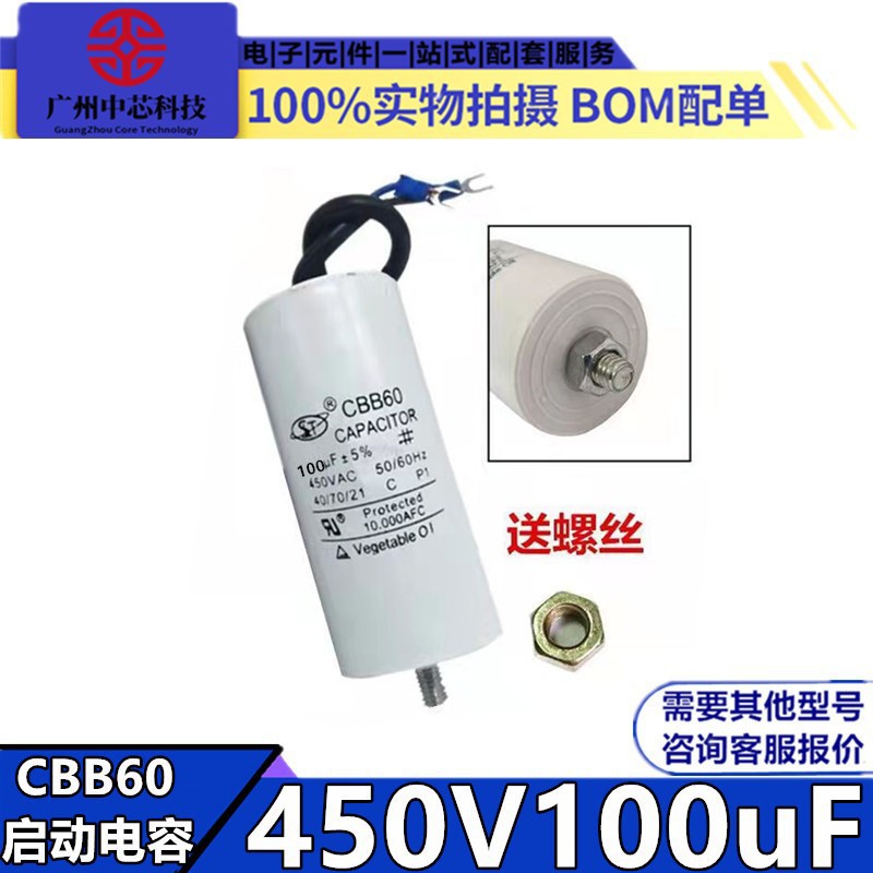 Cbb60スタートコンデンサ薄膜コンデンサ450vufシースリードネジ付単相モータ交流コンデンサ