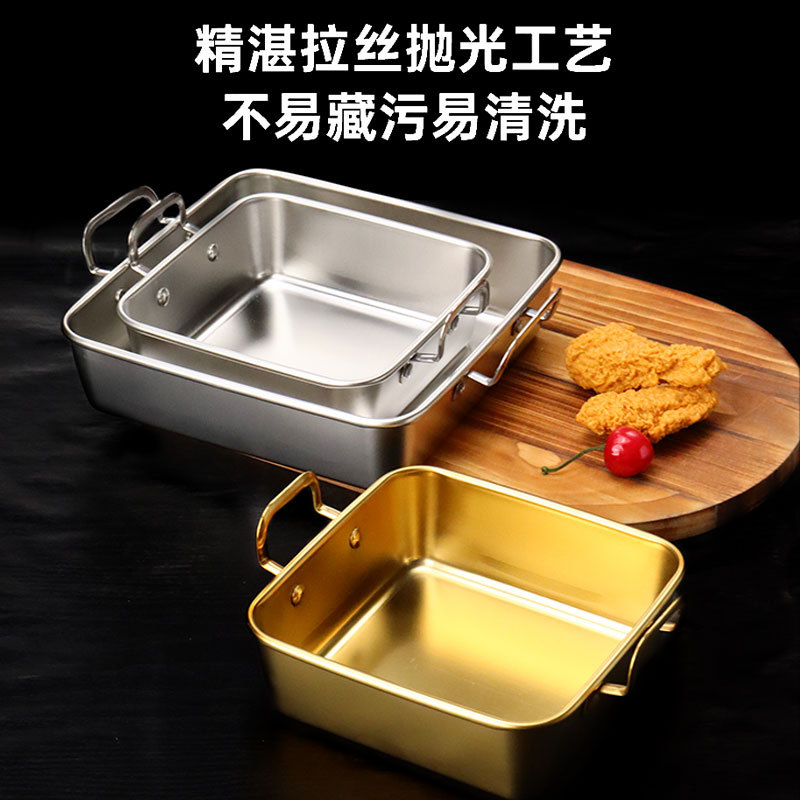 ステンレスのアイデアの両耳の四角形の皿の韓国式の金色のフライドチキンのフライドポテトの皿の平底の軽食のトレーのティラミスの皿