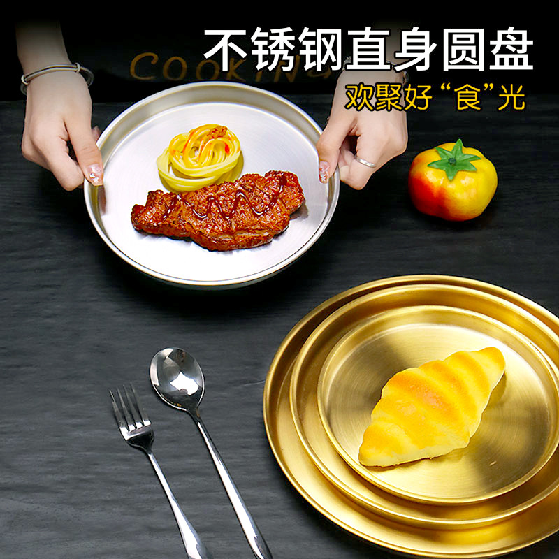ステンレスの厚い円盤の平底の浅い皿の狭い辺のまっすぐな大きいサイズの円形のトレーの金色の焼肉の皿の料理の皿の食事の皿