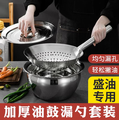 ステンレスのスプーンを厚くして揚げた鍋の家庭料理人の油が台所に漏れています。