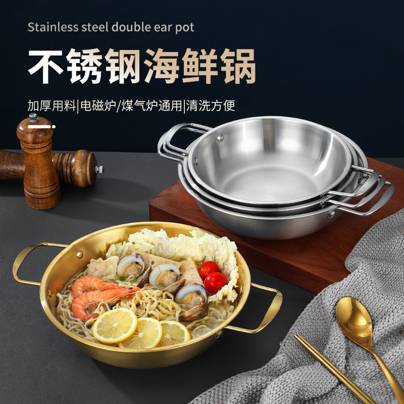 ステンレス海鮮飯鍋韓国カップラーメン鍋金色部隊小鍋スープ鍋商用双耳平底乾燥鍋盆