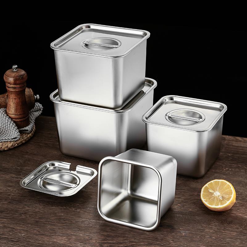 ステンレスの四角形のジャムのたらいは深く大容量の業務用台所の調味料の缶の蓋の正方形の原料の調味料の箱を持ちます。