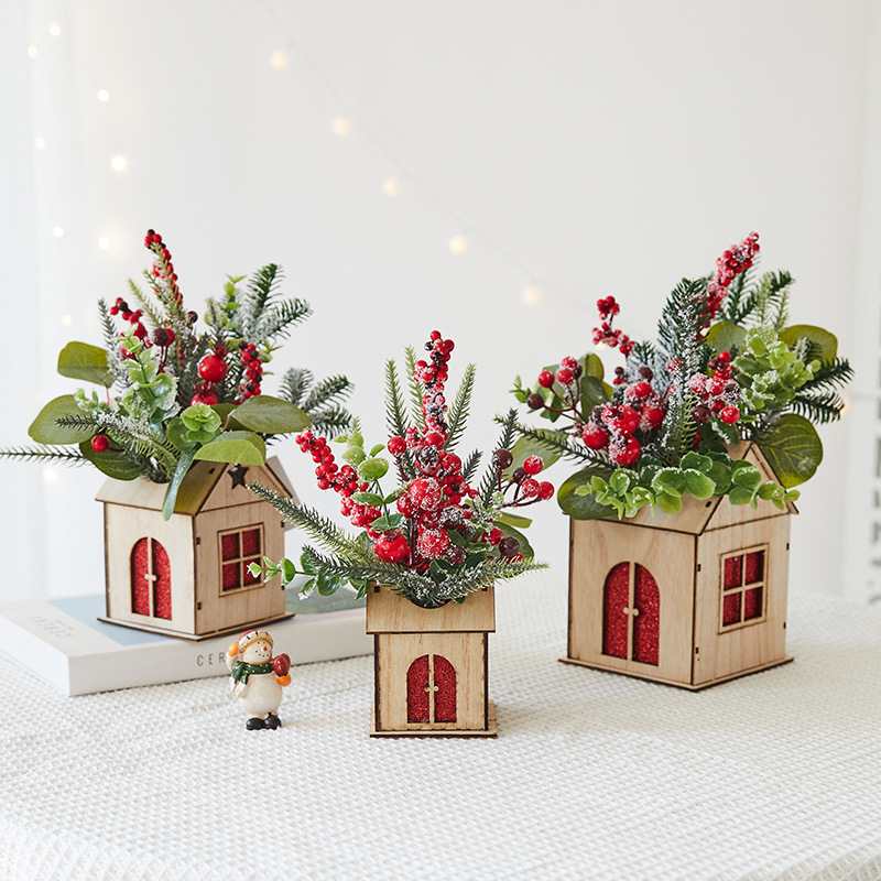 2024年クリスマスデコレーション、小さな木造小屋、クリスマスツリー、鉢植え、卓上装飾、シーンレイアウト、クリエイティブなクリスマスオーナメント