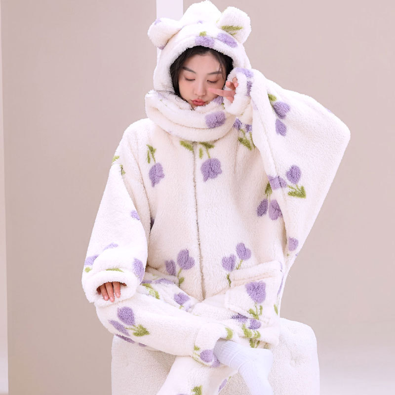 パジャマの女性のサンゴの毛の寝衣の女子学生の中で長いタイプの秋冬の玉桂の犬は厚い柔らかい妹の大きい耳の犬のパジャマの冬を厚くします。