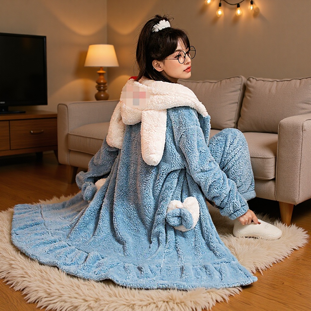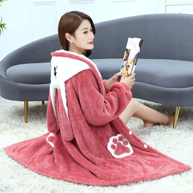 秋冬のピンクの長い耳のウサギの寝衣の女性のフランネルの長いタイプは厚くてかわいいウサギのパジャマの女性の家庭服は外で着ることができます。