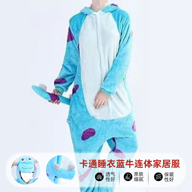 秋冬のかわいい子供の漫画の演出服の青い牛の連体服の動物の部屋の服の厚いパジャマのフランネルのパジャマ
