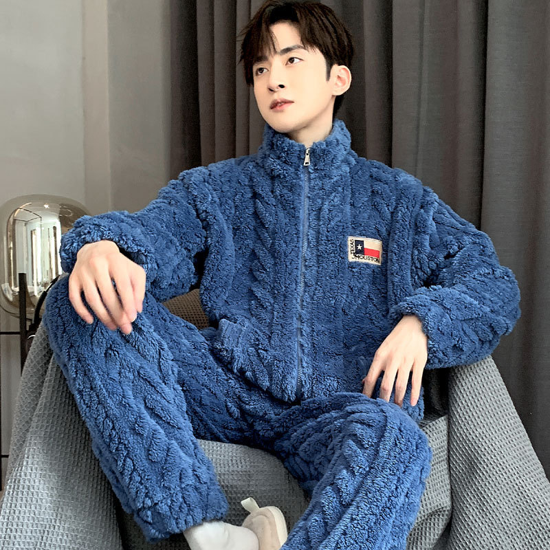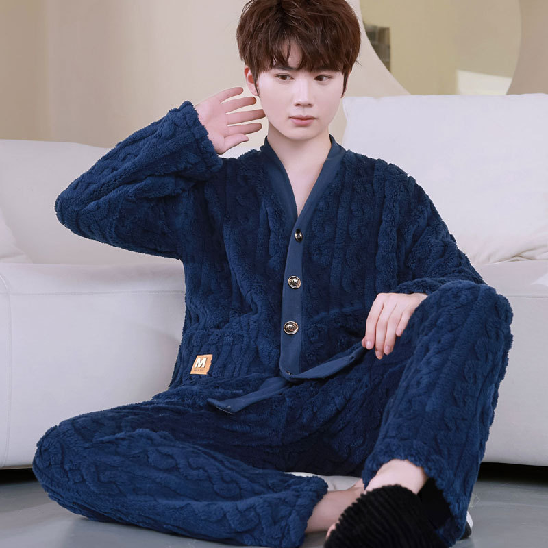 フランネル秋冬パジャマ男性カーディガンの大きいサイズは、厚いベルベット男性のぬいぐるみセットの家庭服を着ることができる