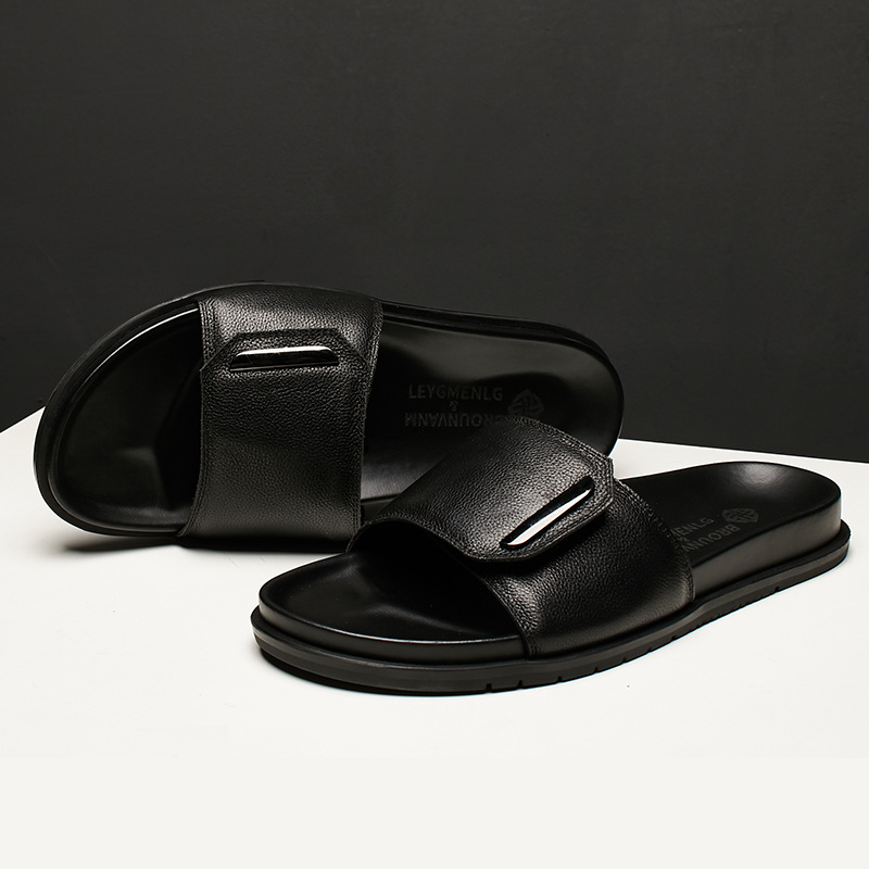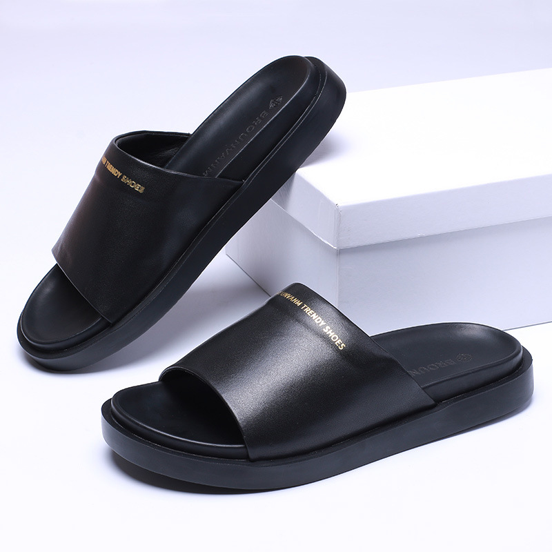 スリッパ男潮夏外着一字引き2020新型室外真皮サンダル男純黒靴引き男潮牌