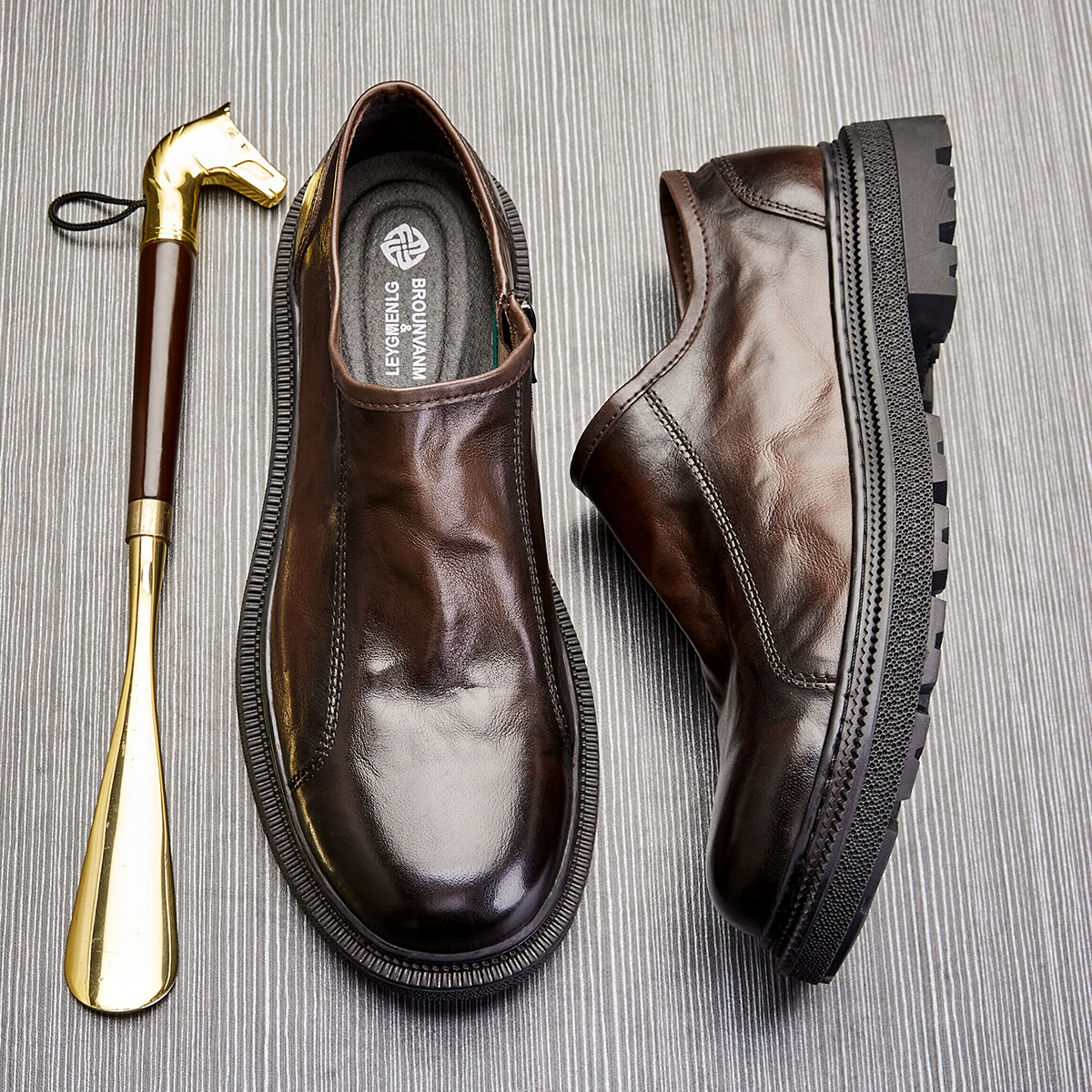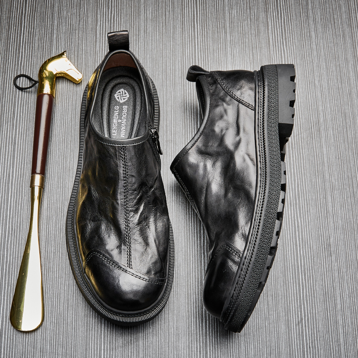 男性のビジネスカジュアル本革の丸い靴夏の新型の個性は厚い底のファスナーの青年の革靴をつなぎ合わせます。