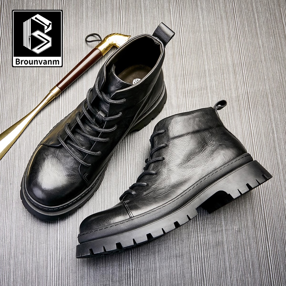 冬の中で本革のブーツのファッションの丸い頭の工装の靴のチェルシーの靴のファッションのレジャーの厚い底の機関車のマーティンの靴の男を手伝います。