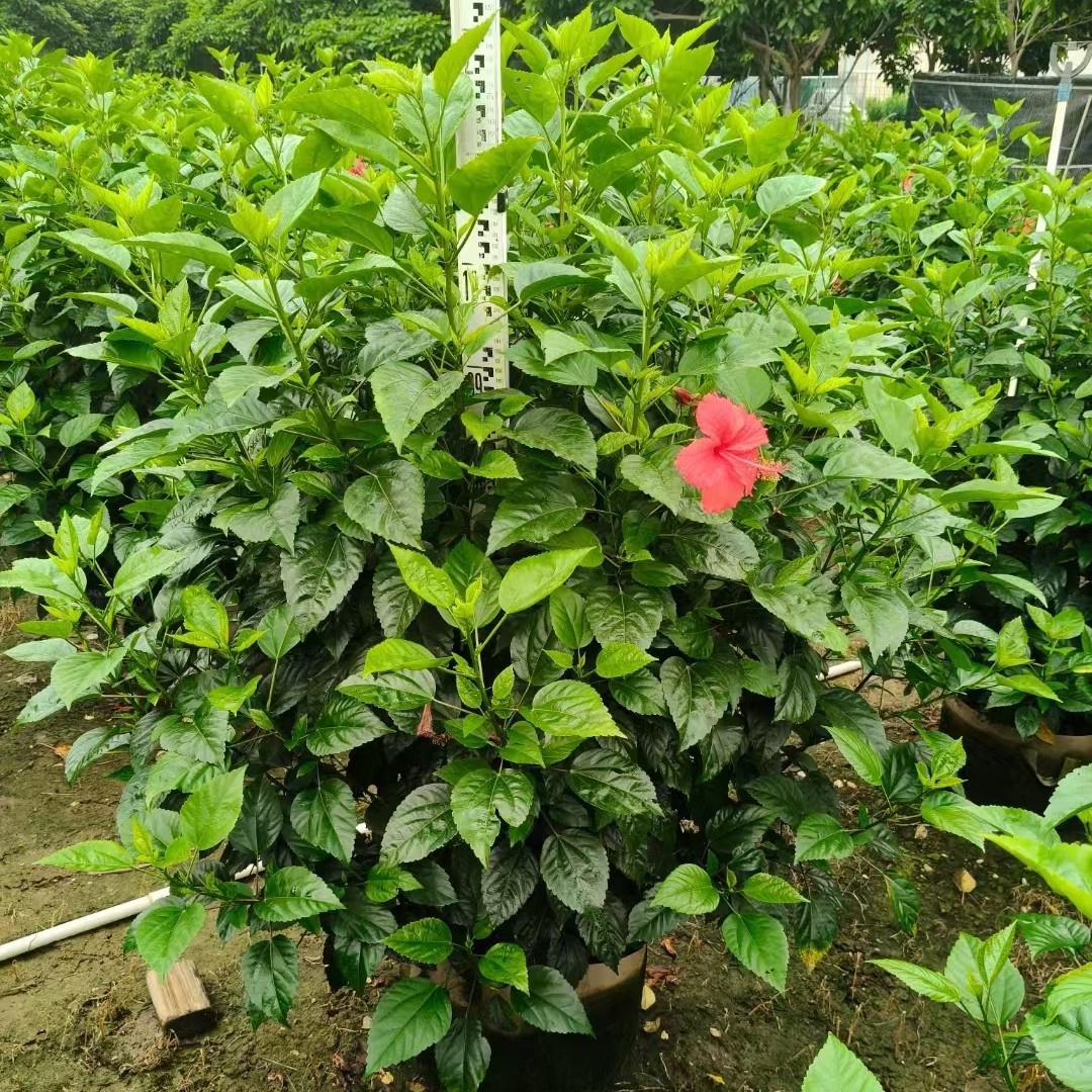 ハイビスカス、フサ、大きな赤い花の球根、観賞用の花と葉の低木、公園の中庭の緑の植物、生垣、並木、風景樹