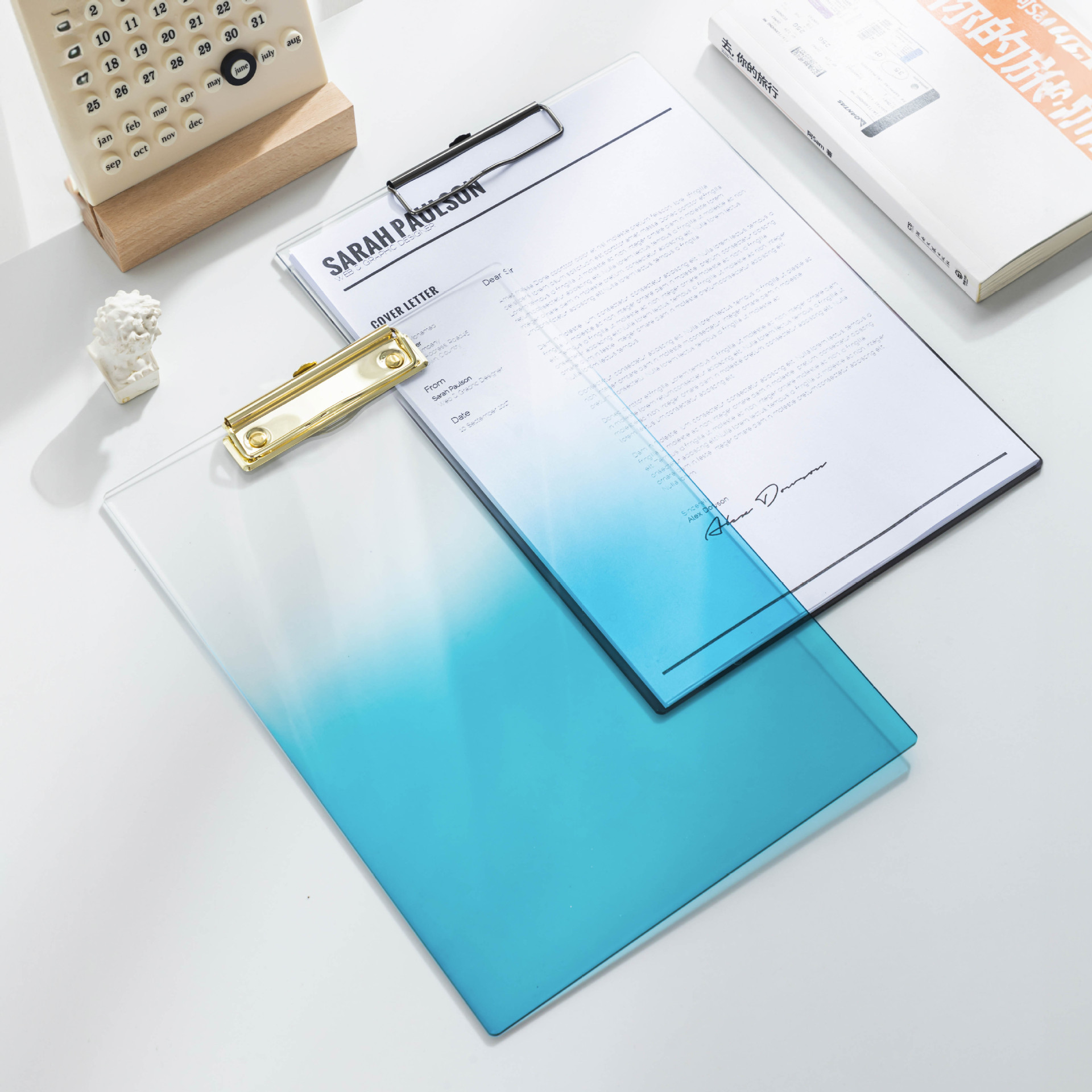 銘強は国境を越えたグラデーションカラーのアクリル板を厚くして、a4の書きパッド書類を整理して、クリップファイルを整理します。